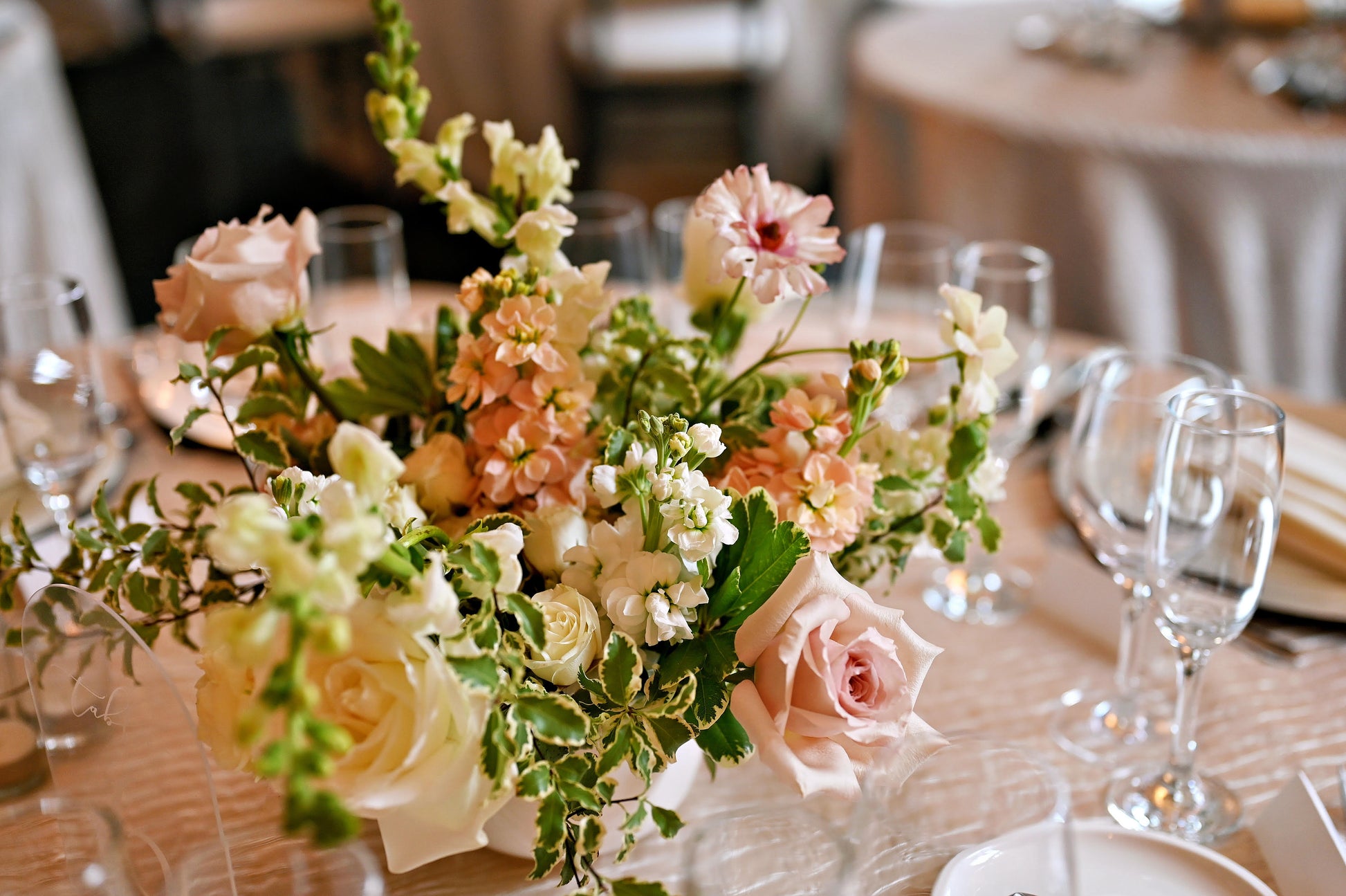 For an elegant vibe. Large, lush arrangement filled with white, blush, and taupe blooms with a touch of greenery. Soft and fluffy blooms for the ultimate elegant feel, filling the room with a magical glow.
