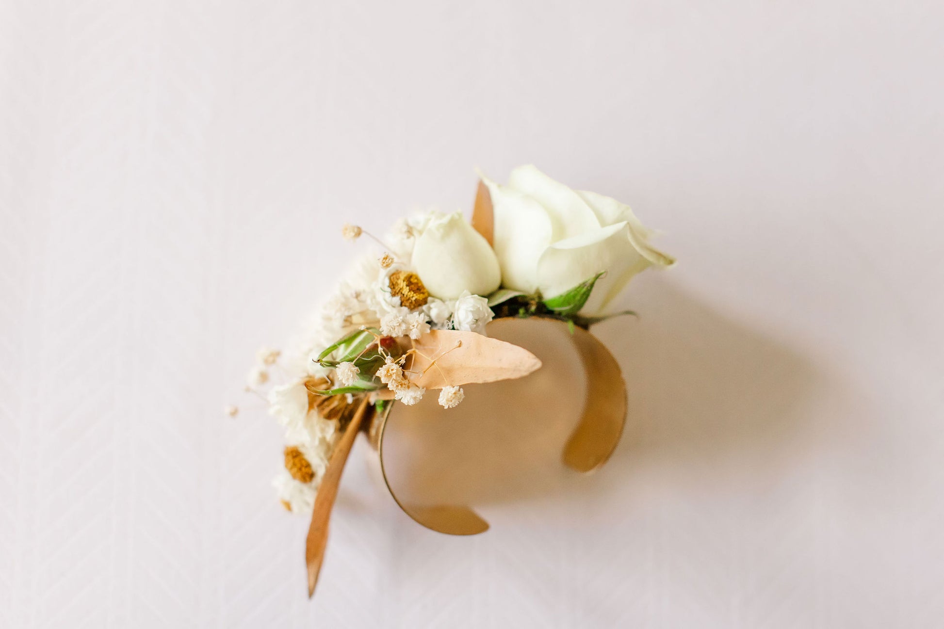 For our earthy couples. Gold cuff with dried and fresh floral elements.